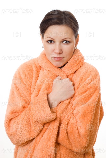 Красивая девушка, стоя в оранжевом халате на белом фоне