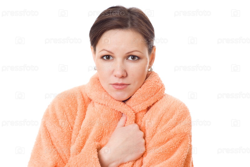 Красивая девушка, стоя в оранжевом халате на белом фоне