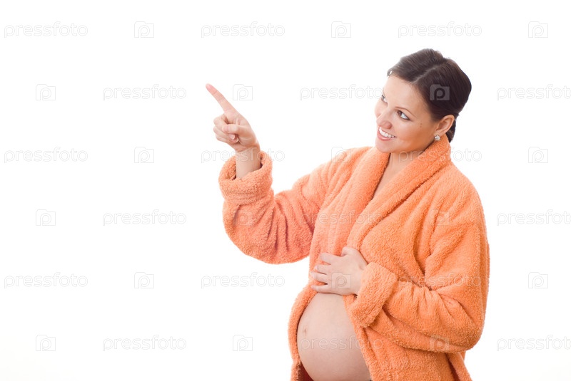 Красивая девушка, стоя в оранжевом халате на белом фоне