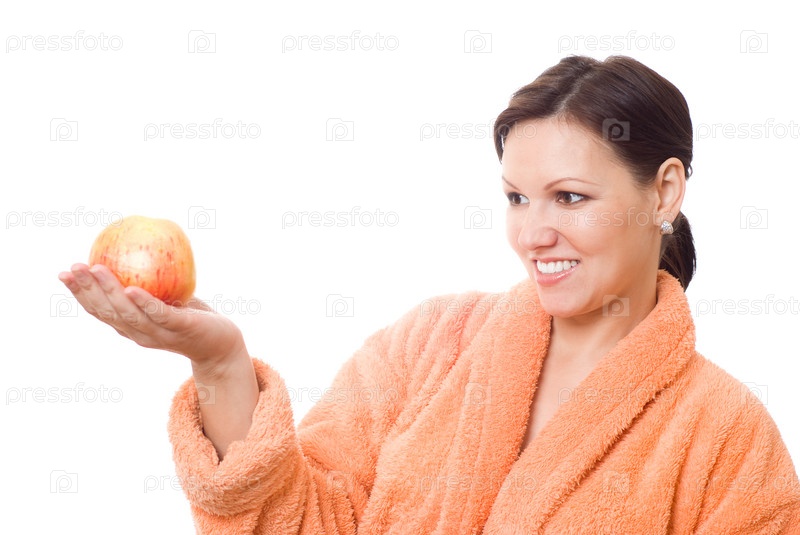 Красивая девушка, стоя в оранжевом халате держит яблоко. Белый фон