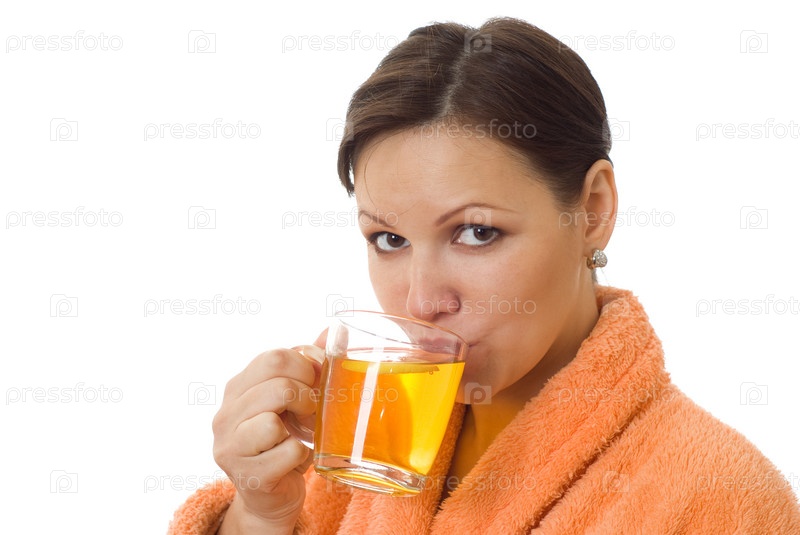 Красивая девушка, стоя в оранжевом халате пьет чай на белом фоне
