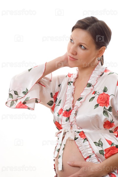 Красивая беременная женщина в халате, на белом фоне