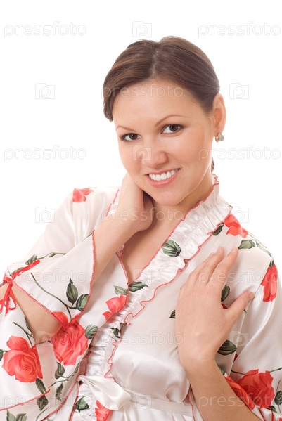 Красивая беременная женщина в халате, на белом фоне