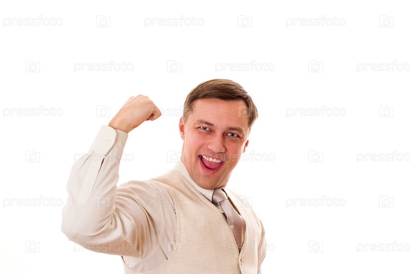 Радостный деловой человек, стоящий на белом фоне