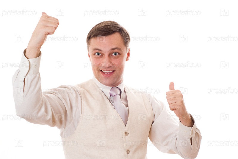 Радостный деловой человек, стоящий на белом фоне