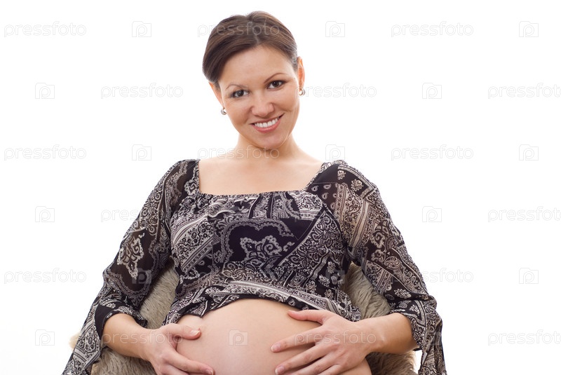 Красивая беременная женщина стоит и улыбается на белом фоне