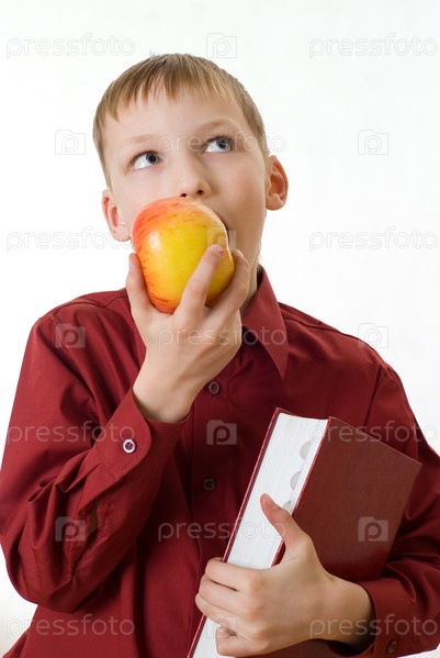 Красивый мальчик ест яблоко