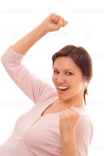 Счастливая женщина в розовом стоит на белом фоне