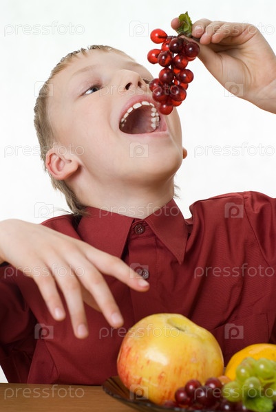 Красивый мальчик в красной рубашке ест виноград
