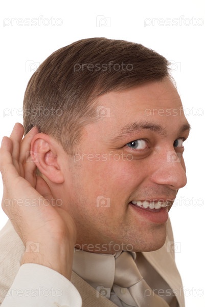 Счастливый бизнесмен, стоит и слушает на белом фоне