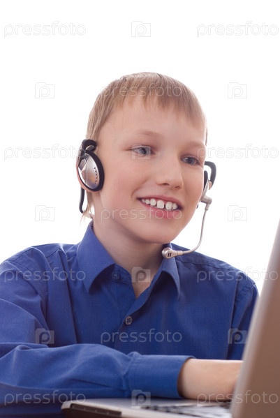 Красивый мальчик в синей рубашке, работает на ноутбуке