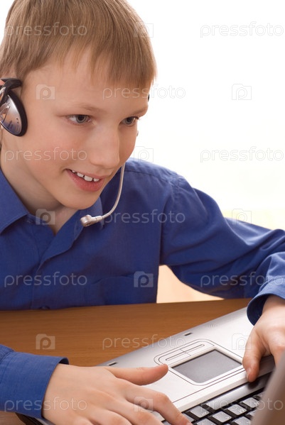 Красивый мальчик в синей рубашке, играет на ноутбуке