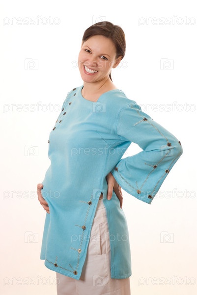 Улыбающаяся женщина стоит в голубом платье