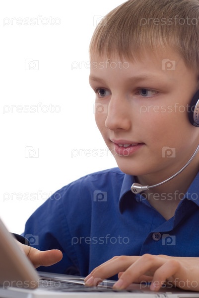 Красивый мальчик в синей рубашке, работает на ноутбуке