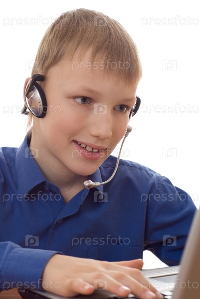 Красивый мальчик в синей рубашке, играет на ноутбуке