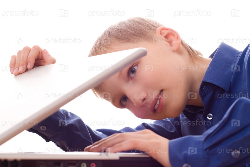 Мальчик в синей рубашке заглядывает в ноутбуке