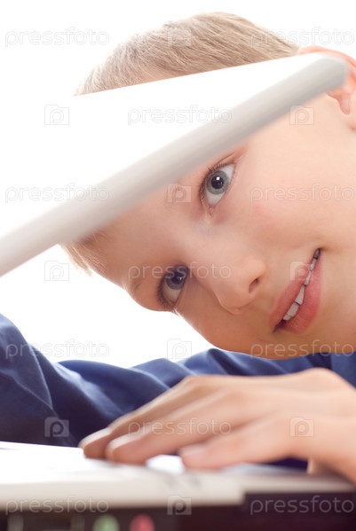 Мальчик в синей рубашке заглядывает в ноутбуке