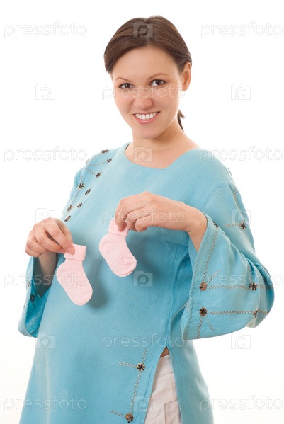 Улыбающаяся женщина стоит в голубом платье с пинетками в руках
