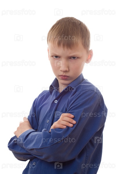 Красивый мальчик в синей рубашке смотрит исподлобья