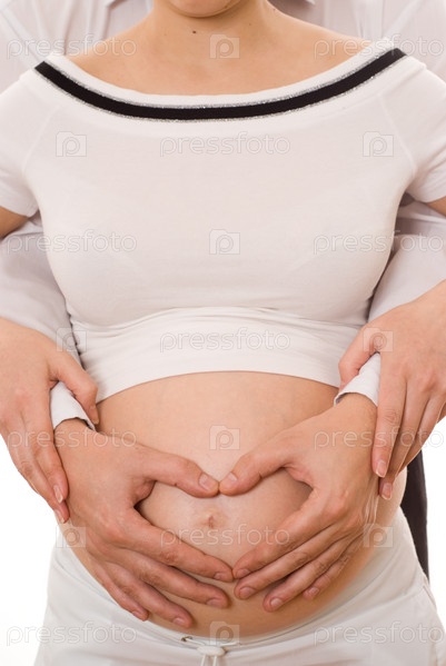 Молодой человек с беременной женщиной держит ее руки на животе на белом фоне