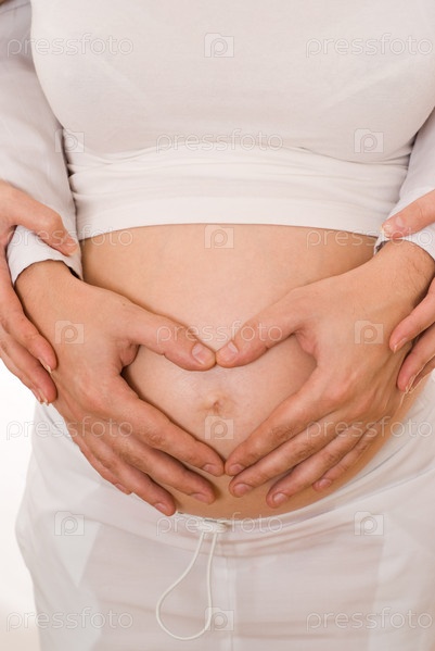 Молодой человек с беременной женщиной держит ее руки на животе изображая сердце на белом фоне