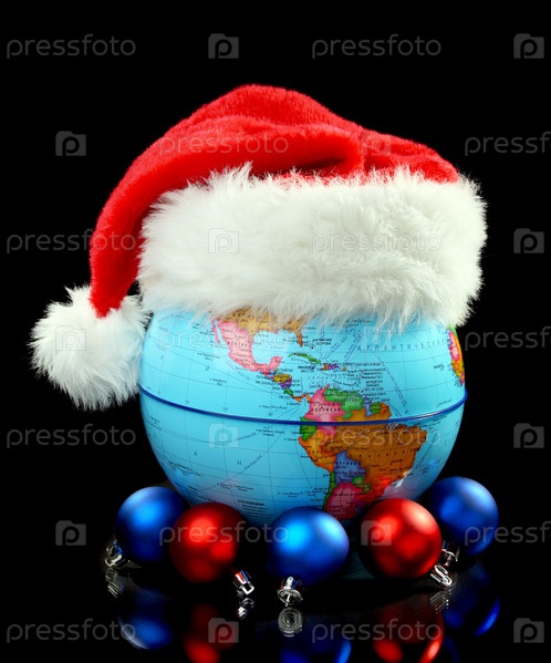 Новогодняя шапка, шары и глобус на черном фоне