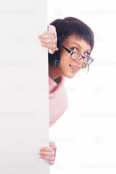 Портрет молодой женщины в очках, выглядывающей из-за пустого плаката
