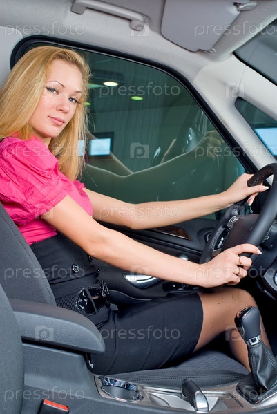 Молодая красивая женщина водит автомобиль