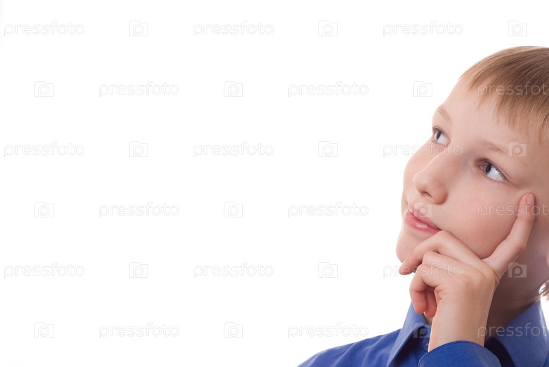 Мальчик в синей рубашке задумчиво смотрит вверх