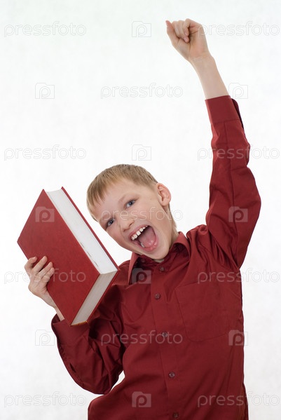 Счастливый мальчик в красной рубашке с книгой