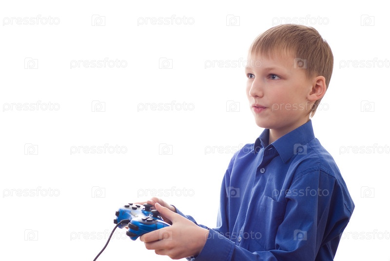 Мальчик в синей рубашке играет в видеоигру