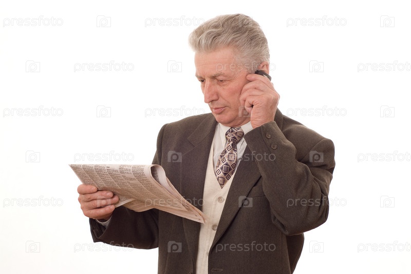 Деловой человек говорит по мобильному телефону и читает газету, на белом фоне