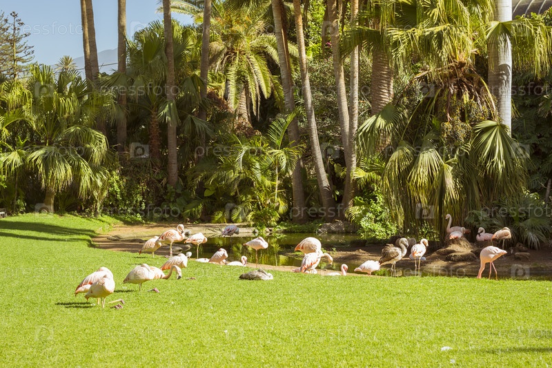 Стаи розовых фламинго на зеленом лугу, Канарские острова, Испания