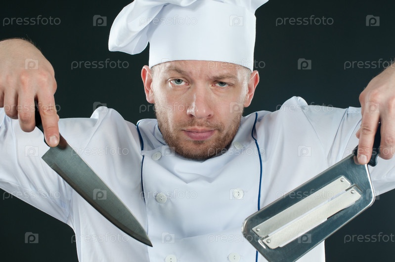 Шеф-повар в униформе с кухонными ножами в руках