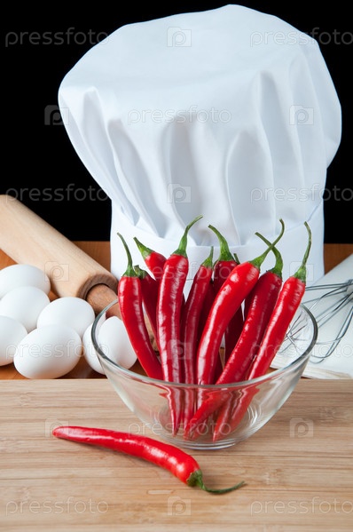 Перцы чили в стеклянной миске, колпак повара и кухонная утварь