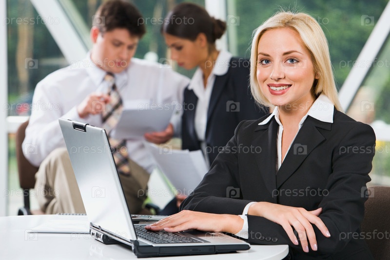 Молодая успешная улыбающаяся женщина, сидящая за столом с ноутбуком и записками на нем