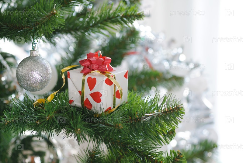Подарок с красным бантом на елке
