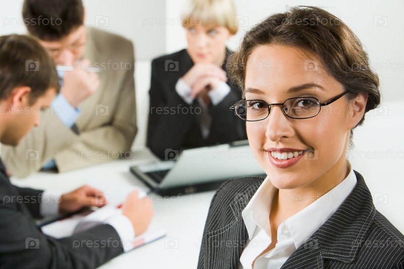 Умная деловая женщина с очками на фоне своей рабочей группы