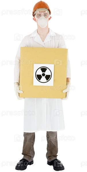Ученый держит картонную коробку с наклейкой знак радиация