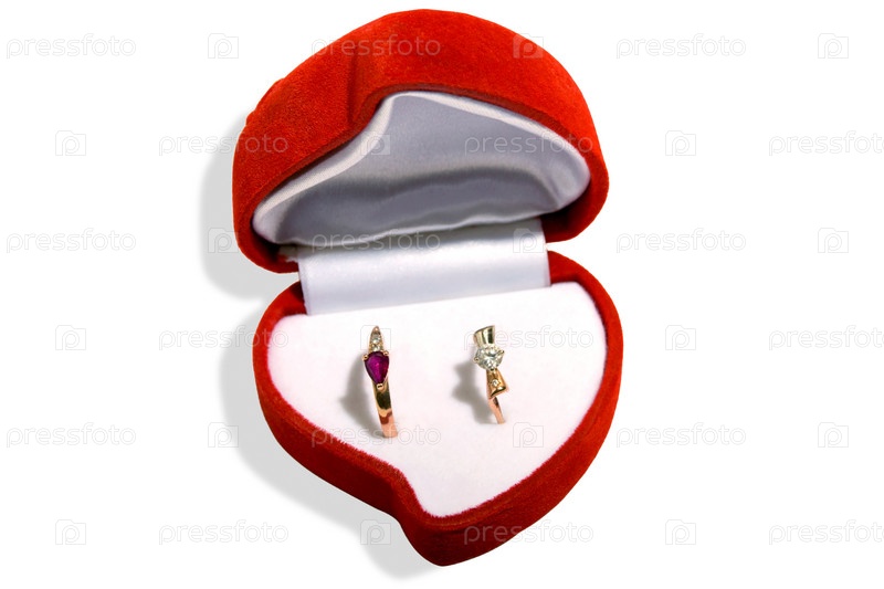 Два золотых кольца в красной коробочке на белом