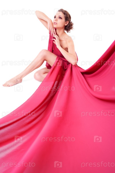 Стройная женщина в красном платье сидит на полу, на белом фоне