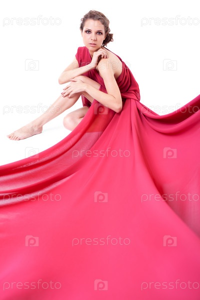 Стройная женщина в красном платье сидит на полу, на белом фоне