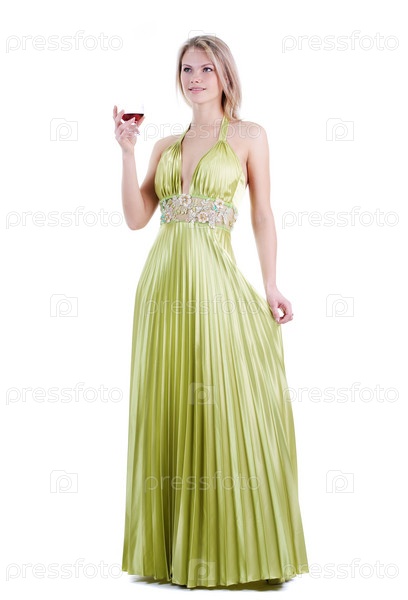 Красивая девушка в зеленом платье с бокалом вина на белом фоне