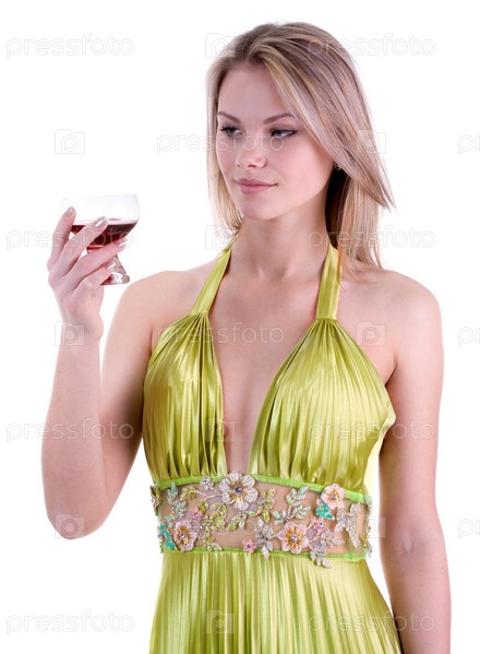 Красивая девушка в зеленом платье с бокалом вина на белом фоне