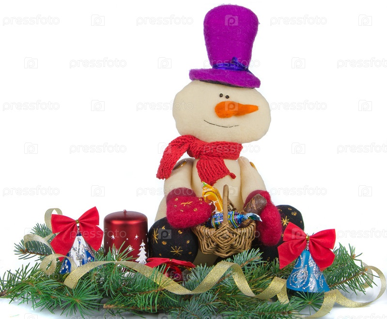 Новогоднее украшение в виде снеговика со свечами и колокольчиками на белом фоне