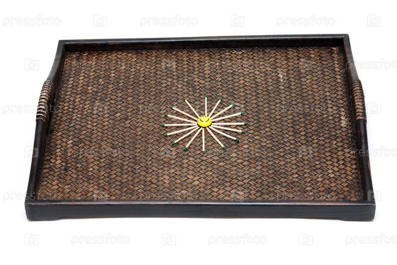 Желтая улыбка с спичкой на бамбуковой подносе вокруг, на белом фоне