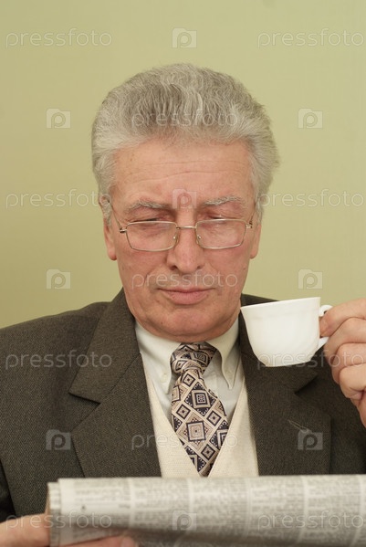 Бизнесмен пьет кофе и внимательно читает газету