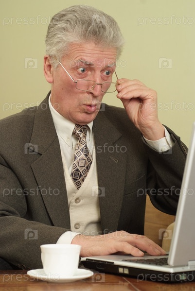 Удивленный бизнесмен смотрит на экран компьютера