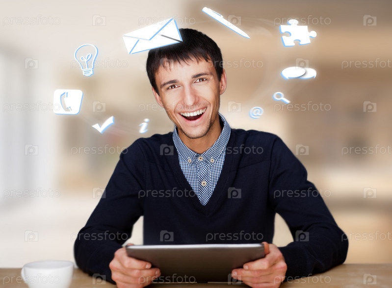 Молодой бизнесмен с различными иконками вокруг головы
