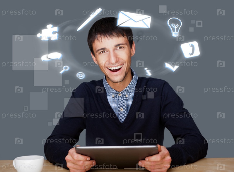 Молодой бизнесмен с различными иконками вокруг головы